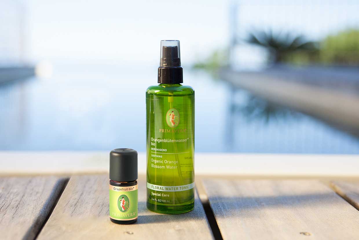 Den Duft eines Pflanzenwassers mit dem passenden ätherischen Öl verstärken, z.B. 3 bis 5 Tr. Grapefruit bio* in das Orangenblütenwasser bio* geben oder 1 bis 3 Tropfen Pfefferminze bio* in das Pfefferminzwasser bio* geben.