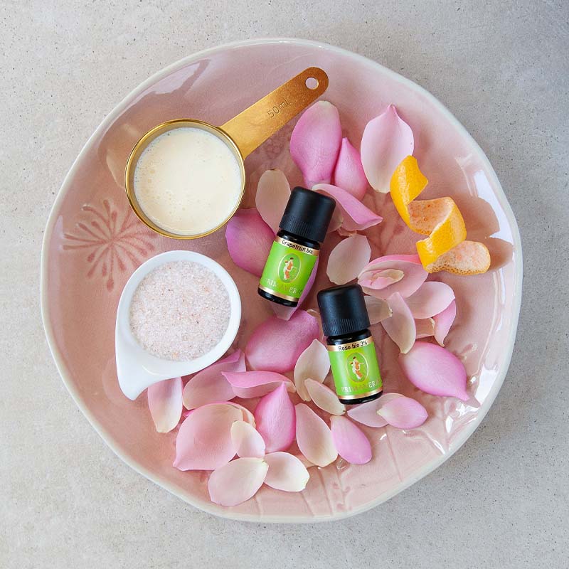 Genieße den blumigen Glücklichmacher von Grapefruit und Rose, als Badezusatz Happy Rose. Mische die ätherischen Öle wahlweise mit Meersalz oder Sahne, dann abtauchen und wohlfühlen.