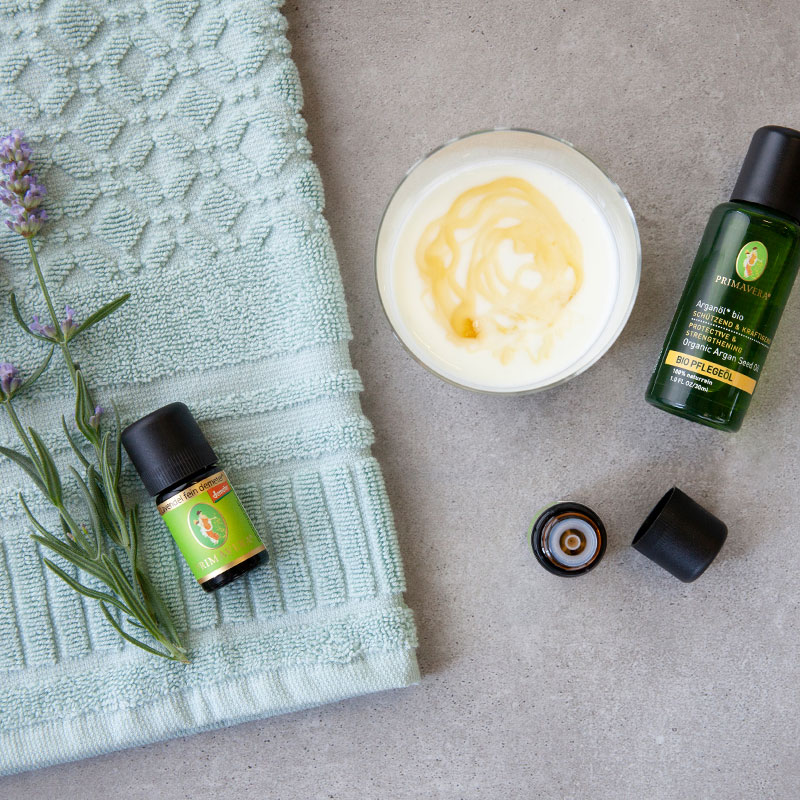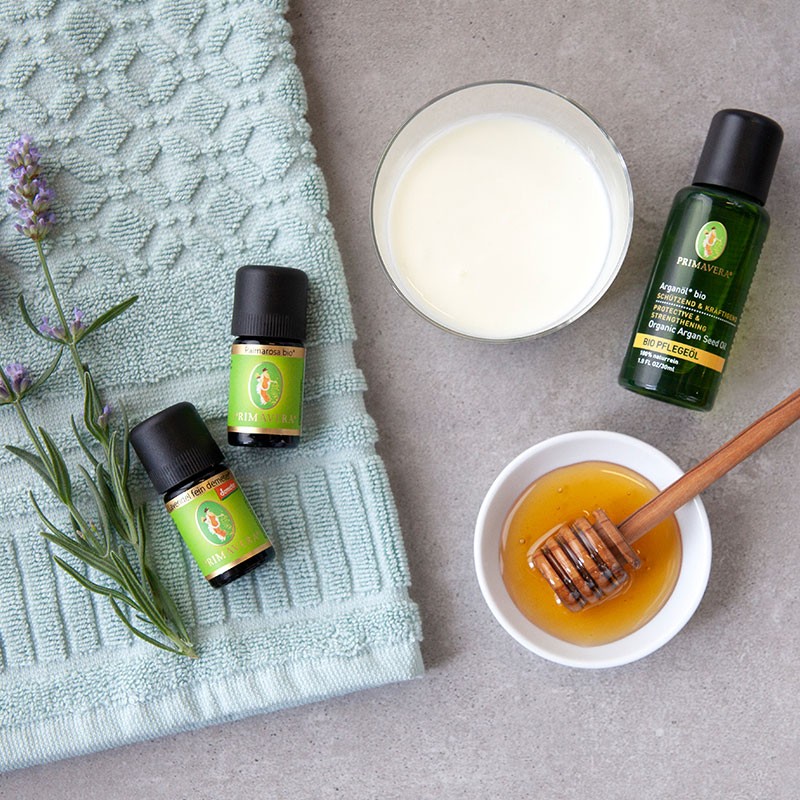 Deine selbstgemachte Auszeit für Haut, Haare und Sinne. Das ätherische Lavendelöl wirkt ganzheitlich entspannend und schenkt Deiner Mähne zusammen mit Palmarosa einen sanften, blumigen Duft. Durch den hohen Gehalt an ungesättigten Fettsäuren spendet Arganöl trockener Kopfhaut und spröden Haaren reichlich Feuchtigkeit. Honig und Joghurt machen das Haar geschmeidig. Besonders Honig schenkt einen schönen Glanz und pflegt zusätzlich die Kopfhaut.
