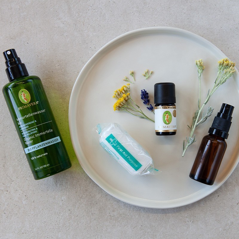 Erste Hilfe Mischung zur regenerierenden Hautpflege und zur Narbenpflege. Das kühlende Spray für beanspruchte Haut nach Stürzen lindert bei Spannungsgefühl der Haut durch blaue Flecken. Es lässt sich einfach mitnehmen und entweder direkt aufsprühen oder für Wickel und Auflagen verwenden. Der Dreiklang aus Immortelle bio, Lavendel fein bio und Cistrose bio ist die bekannte Erste Hilfe Mischung der Aromatherapie.
