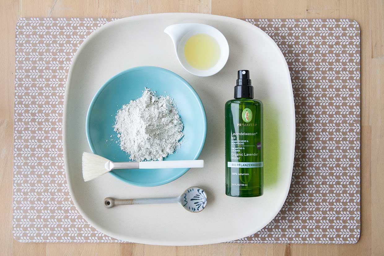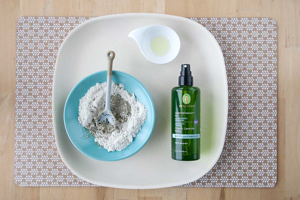 Weiße Tonerde mit Lavendelwasser verrühren, dann Mandelöl dazugeben. Kräftig durchrühren, bis eine glatte Paste entsteht. Bei Bedarf noch etwas Pflanzenwasser hinzugeben, dann wird es flüssiger. Durch die Zugabe von Tonerde wird die Paste fester.