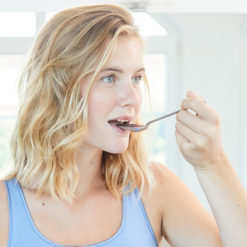Morgens vor dem Zähneputzen, Frühstücken oder Wassertrinken 1 EL von der Mischung für ca. 5 Minuten im Mund bewegen und durch die Zähne ziehen. Anschließend in ein Tuch spucken und im Restmüll entsorgen.