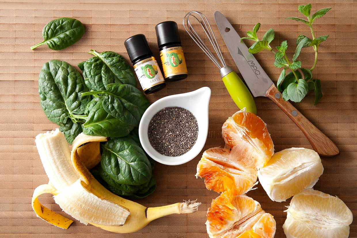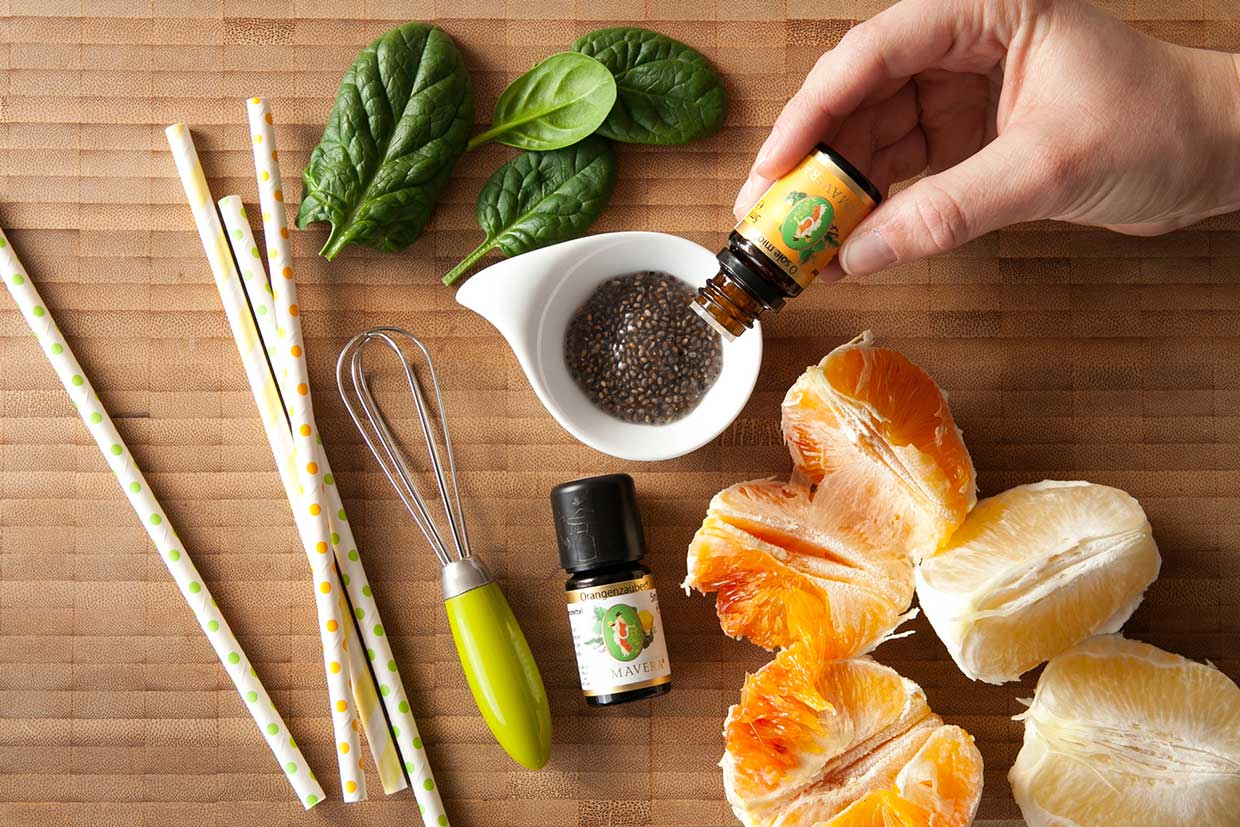 Um das Chiasamengel herzustellen, zuerst 2 EL Chiasamen mit der doppelten Menge Wasser verrühren. Mindestens 1 Stunde quellen lassen. Das Chiasamengel mit 2 Tropfen ätherischem Öl Vegaroma Orangenzauber verrühren. Geschälte Früchte, Spinat und das aromatisierte Chiagel in den Mixer geben. Mit 100 ml Flüssigkeit (z.B. Leitungswasser oder Fruchtsaft) auffüllen. Gründlich durchmixen und pürieren. Nach Bedarf noch Flüssigkeit zugeben.