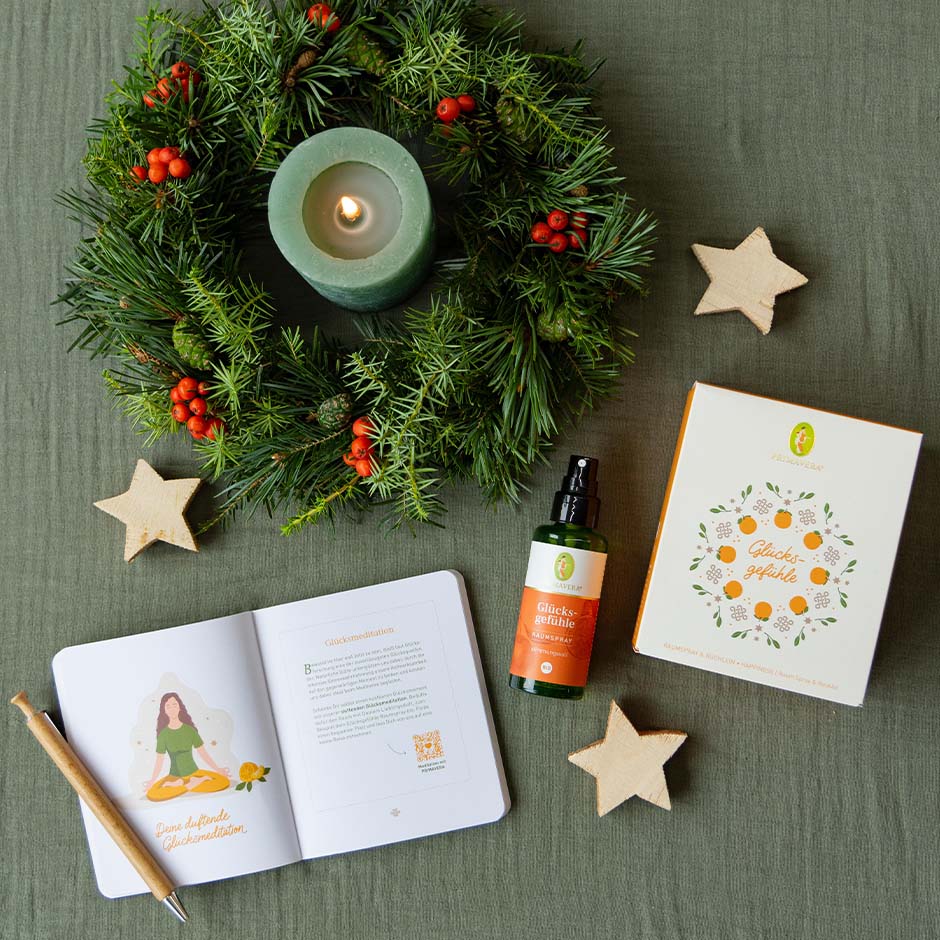 Das Geschenkset lädt mit dem Notizbüchlein aus Recyclingpapier dazu ein, innezuhalten und beim meditativen Schreiben die eigenen Glücksmomente zu Papier zu bringen. Durch sprühen in die Luft schafft das Glücksgefühle Raumspray die richtige Atmosphäre.