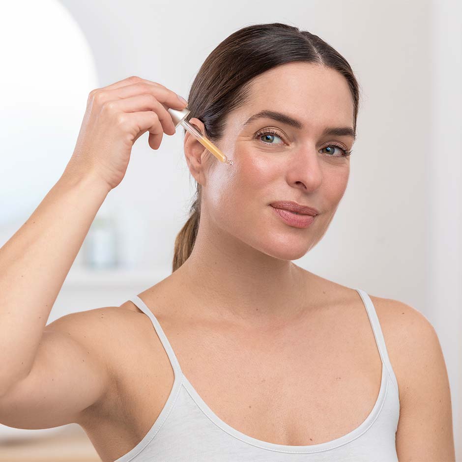 Eine kleine Menge Serum auf die frisch gereinigte, tonisierte Gesichtshaut auftragen und sanft einmassieren.