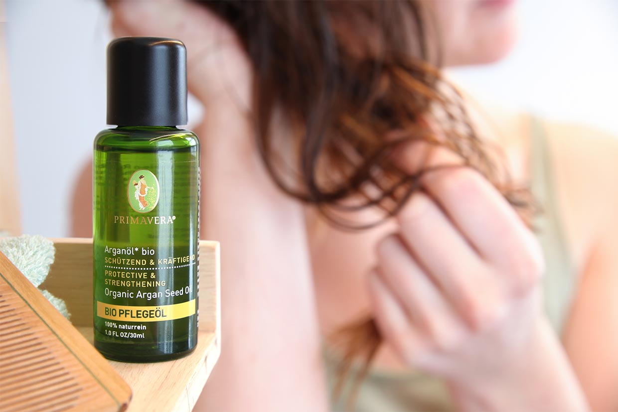 Eines der bewährtesten Haarpflegeöle ist Arganöl bio. Der Arganbaum zählt zu den ältesten Bäumen der Welt – wohl auch, weil er in seiner Heimat Marokko ein wahrer Überlebenskünstler ist. Sein an Vitamin E und wichtigen Antioxidantien reiches, goldenes Öl wird dort traditionell in der Küche sowie zur Haut- und Haarpflege verwendet. Dank seiner intensiv pflegenden Eigenschaften sorgt es auch bei trockenem Haar für seidigen Glanz, kräftigt spröde Spitzen und macht das Haar leicht kämmbar.
