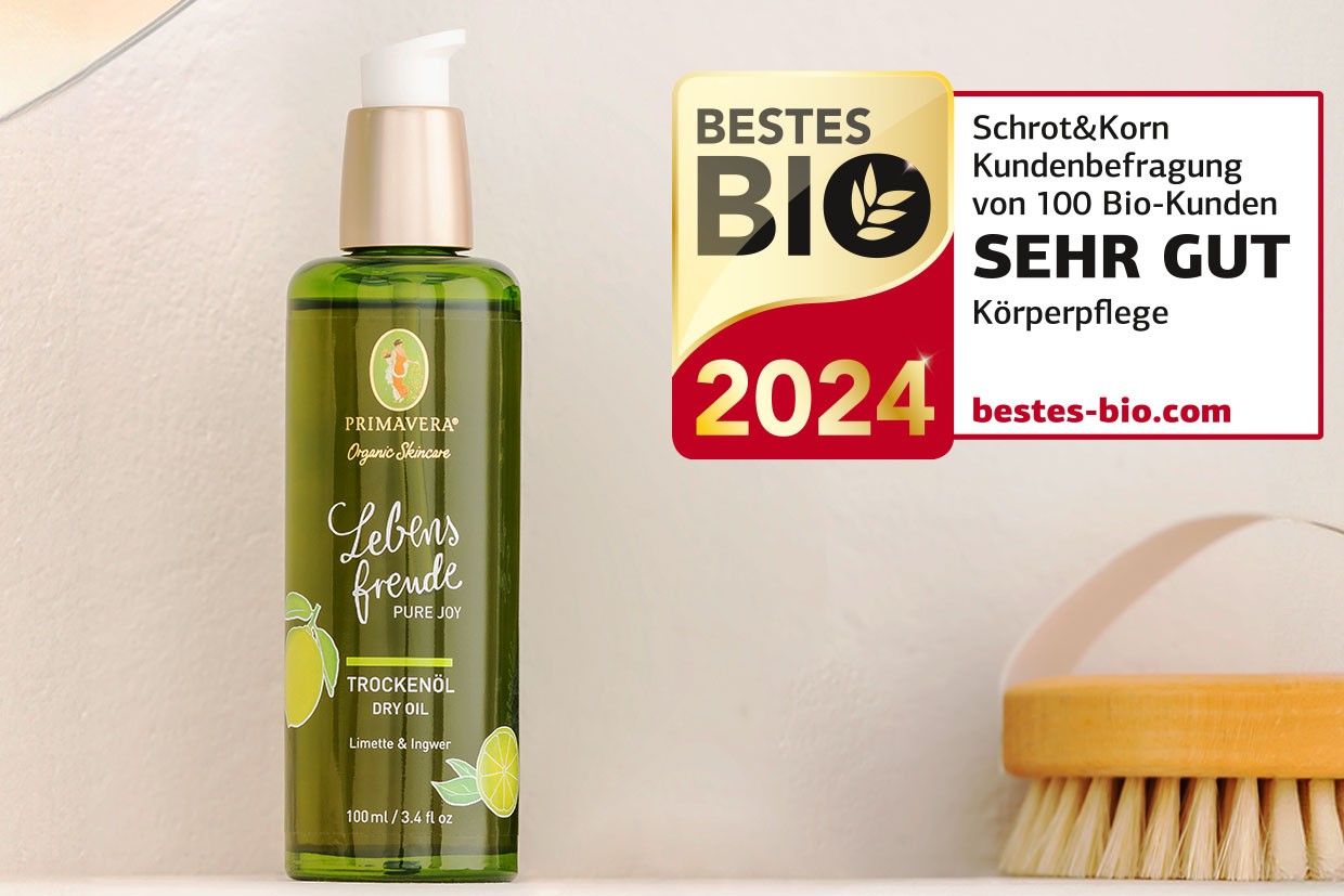 Unser Lebensfreude Trockenöl ist von der (nach eigenen Angaben auflagenstärksten) Zeitschrift im Bio-Bereich „Schrot & Korn“ als eines der besten Bio-Produkte 2024 ausgezeichnet worden. Die Auszeichnung genießt einen hohen Stellenwert in der Bio-Branche, denn sie steht für etablierte Bio-Qualität und Innovation.
