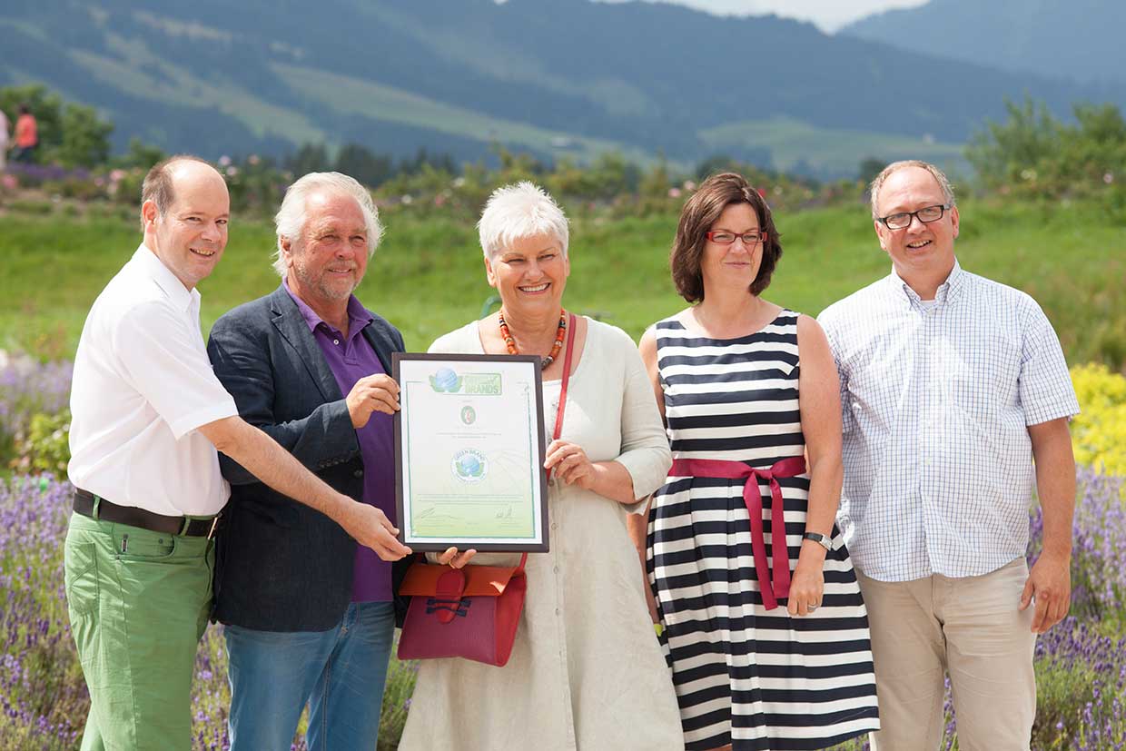 Grund zum Feiern gab es für PRIMAVERA in Sachen authentischer Nachhaltigkeit: Im Rahmen des traditionellen Rosenfests im Juli 2015 wurde PRIMAVERA erneut mit dem Umweltsiegel GREEN BRANDS GERMANY 2015/2016 ausgezeichnet, das nachhaltiges Handeln nach verschiedenen Kriterien bewertet. Die Übergabe erfolgte feierlich durch Norbert Lux, CCO der internationalen GREEN BRANDS Organisation (von links) an die Unternehmensgründer Kurt L. Nübling und Ute Leube sowie die beiden PRIMAVERA-Geschäftsführer Uta Landt und Titus Kaufmann.