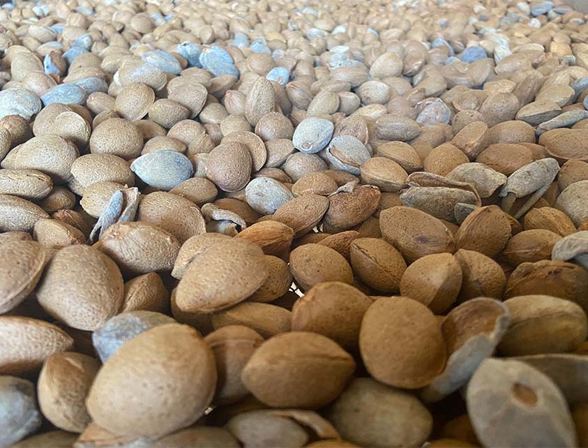 Anschließend werden die Mandeln, die von einer Haut sowie einer harten Schale umgeben sind, schonend geknackt und vorsichtig von ihrer Schale befreit. Um die höchste Frische des Öls zu gewährleisten, werden die Mandeln erst geknackt, wenn ein Pressauftrag vorliegt. Dann werden die Kerne zu unserem Bio Anbaupartner gebracht, der schließlich aus den Nüssen das hellgelb schimmernde aromatische Mandelöl gewinnt.