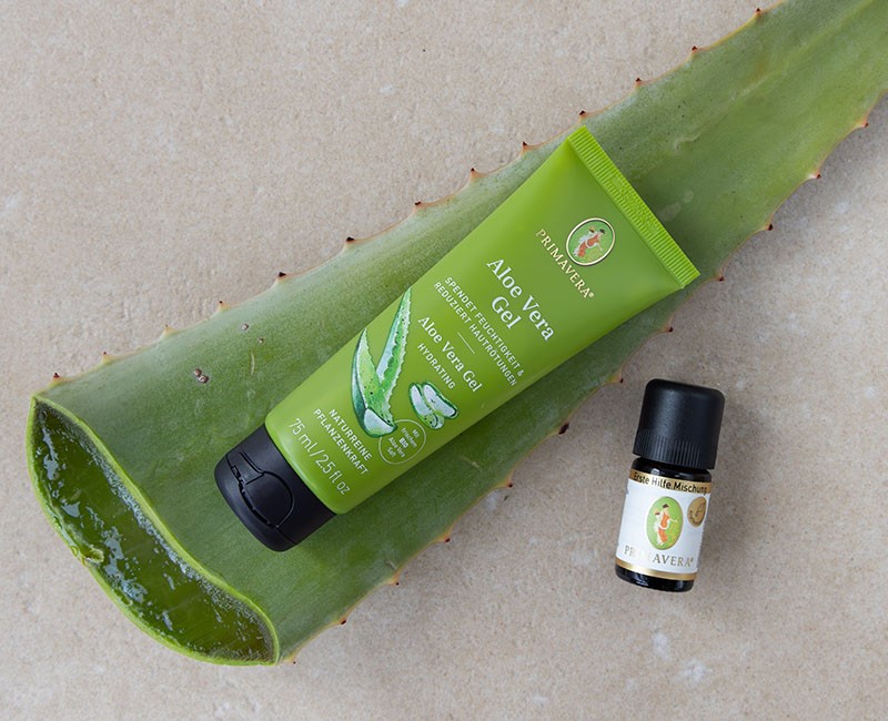 Nach einem intensiven Sonnentag spendet Aloe Vera die Feuchtigkeit, die die Haut dringend braucht. Mit den ätherischen Ölen Lavendel fein und Pfefferminze verfeinert, verwandelt sich das Gel in eine kühlende und regenerierende Hautpflege, die bei Sonnenbrand begleitet, aber auch bei Juckreiz oder Neurodermitis.