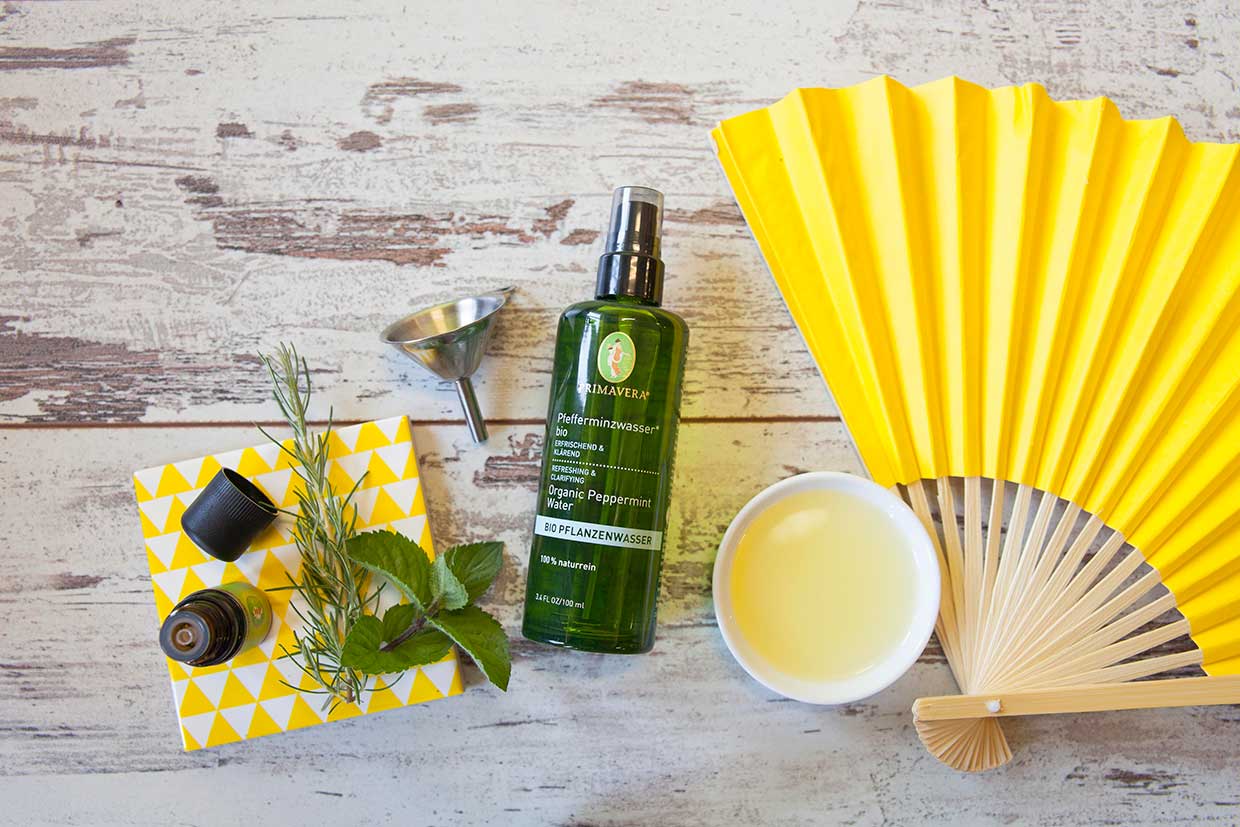 Das ätherische Öl Rosmarin Campher in das Aprikosenkernöl tropfen und vermischen. Dann zum Pfefferminzwasser hinzugeben und gut schütteln.