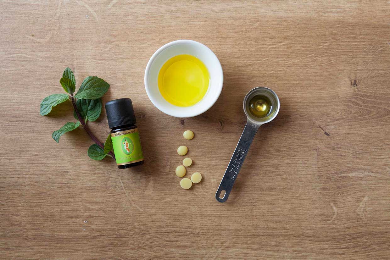 Ätherische Öle mit dem Jojobaöl vermengen. Kakaobutter exakt abwiegen und die Menge in eine Glasschüssel geben. Im nächsten Schritt einen Topf mit Wasser erhitzen und die Glasschüssel in das erwärmte Wasser stellen, und die Butter schmelzen zu lassen. Nach der Entnahme der Schüssel aus dem Wasser, das Jojobaöl mit den ätherischen Ölen hinzugeben und alles gut verrühren. Die Eigenkreation nun für 4 Stunden in den Kühlschrank stellen.